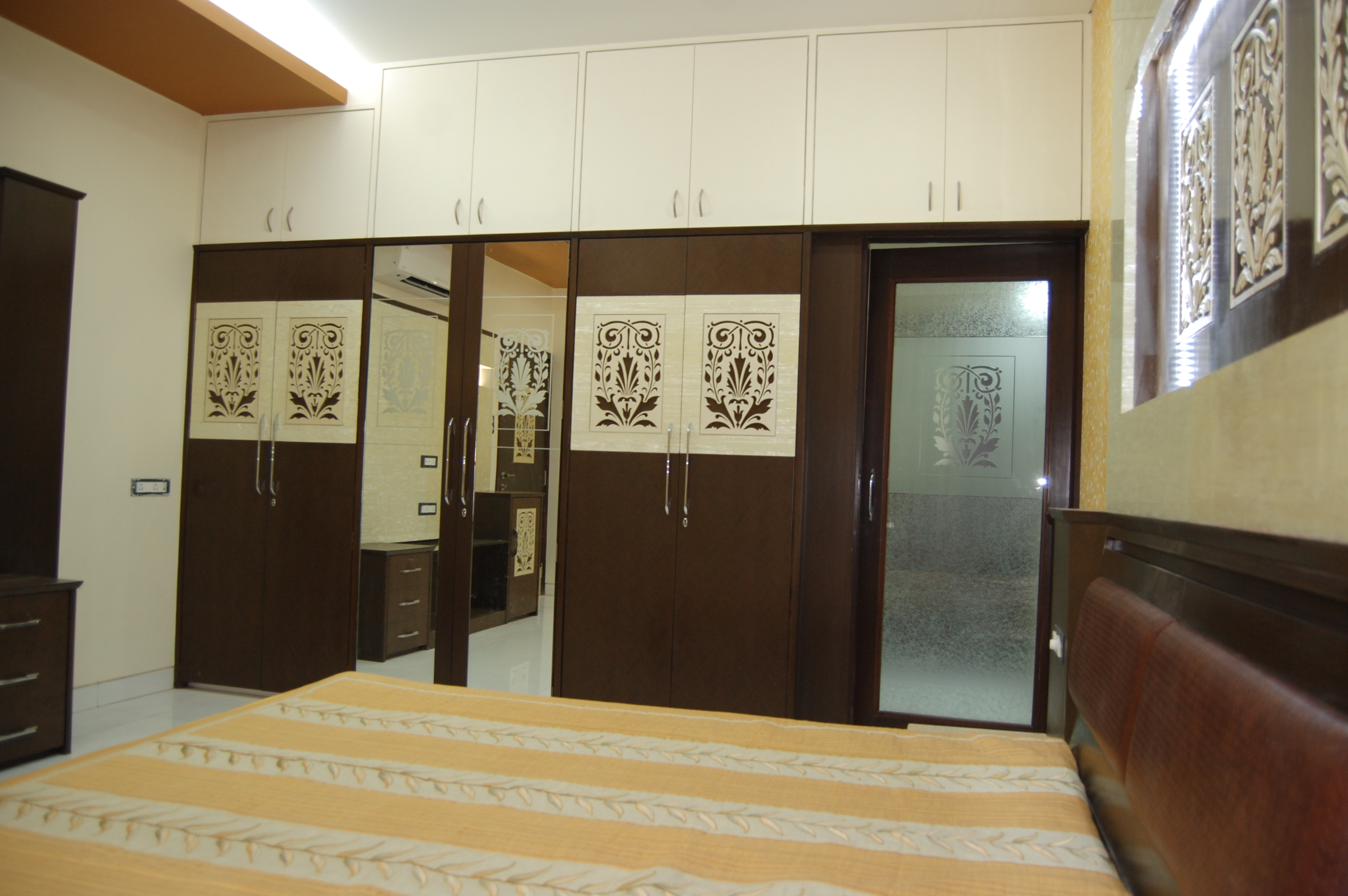 Computer numerical controlled machines offer precise cutting in most of the surfaces, this bed room uses such panels on the wardrobes.